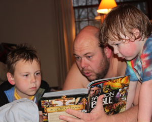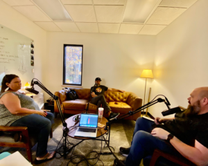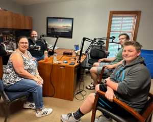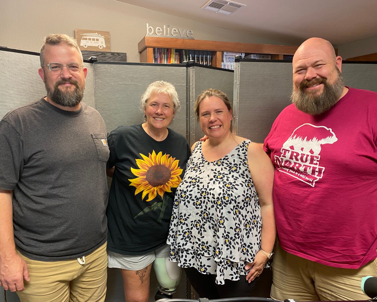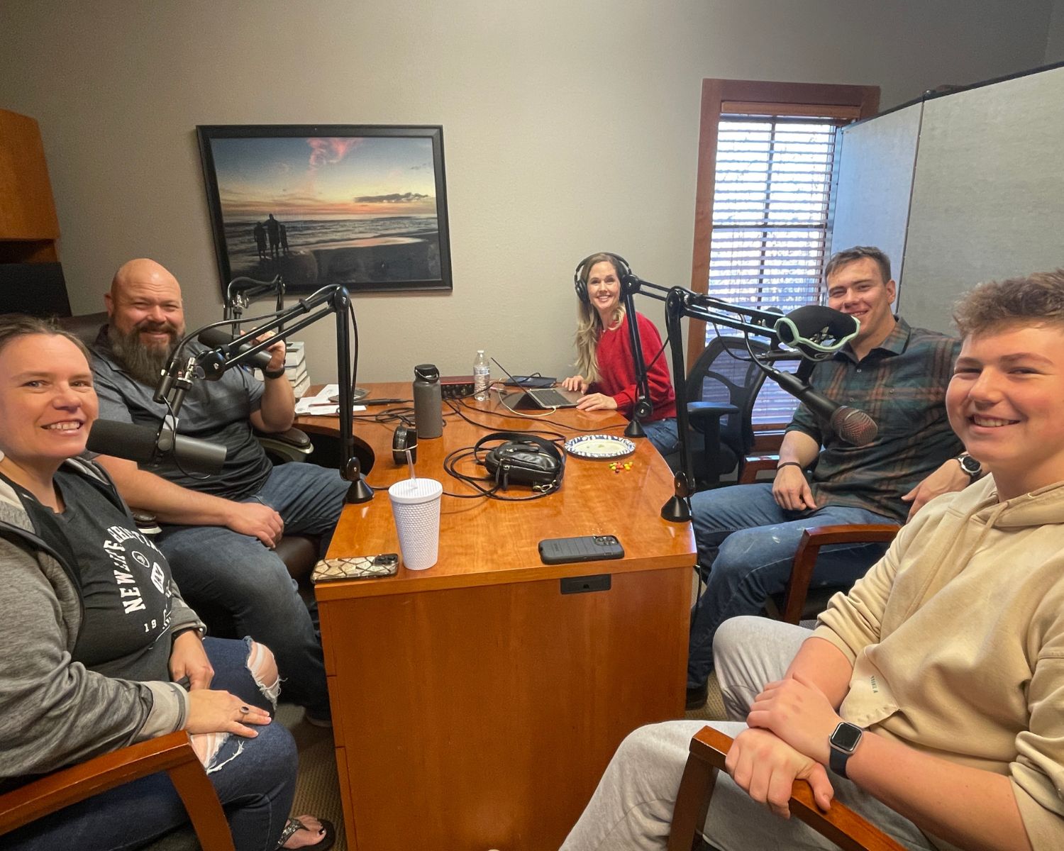 - The Williams Family in the recording studio (aka Pastor Joe’s office). Pictured L to R: Kirsten, Pastor Joe, Neil, Brock