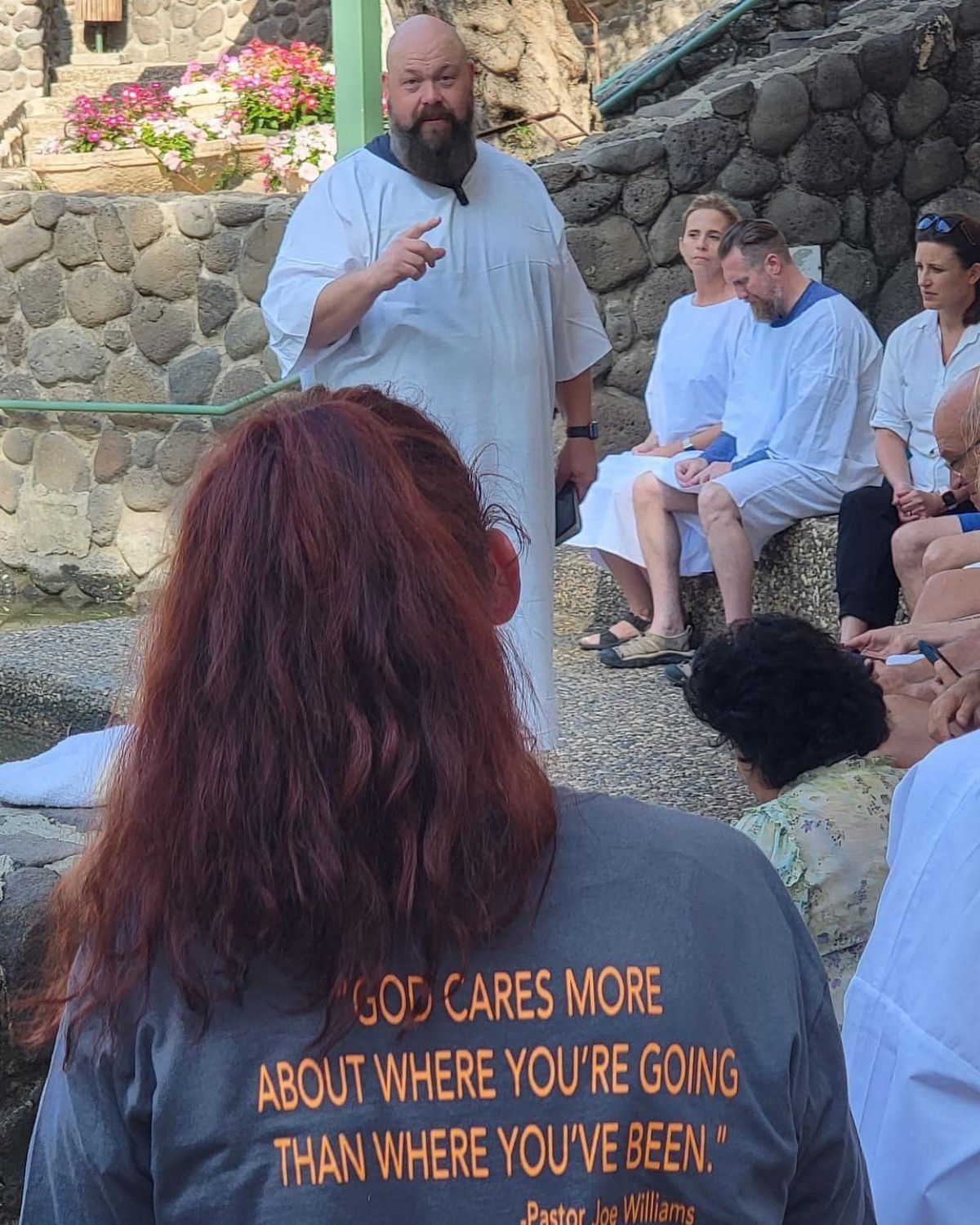 - Jennifer Banes wearing the Celebrate Recovery shirt with Pastor Joe’s saying at the baptism site on the Jordan River in Israel, June 2023.