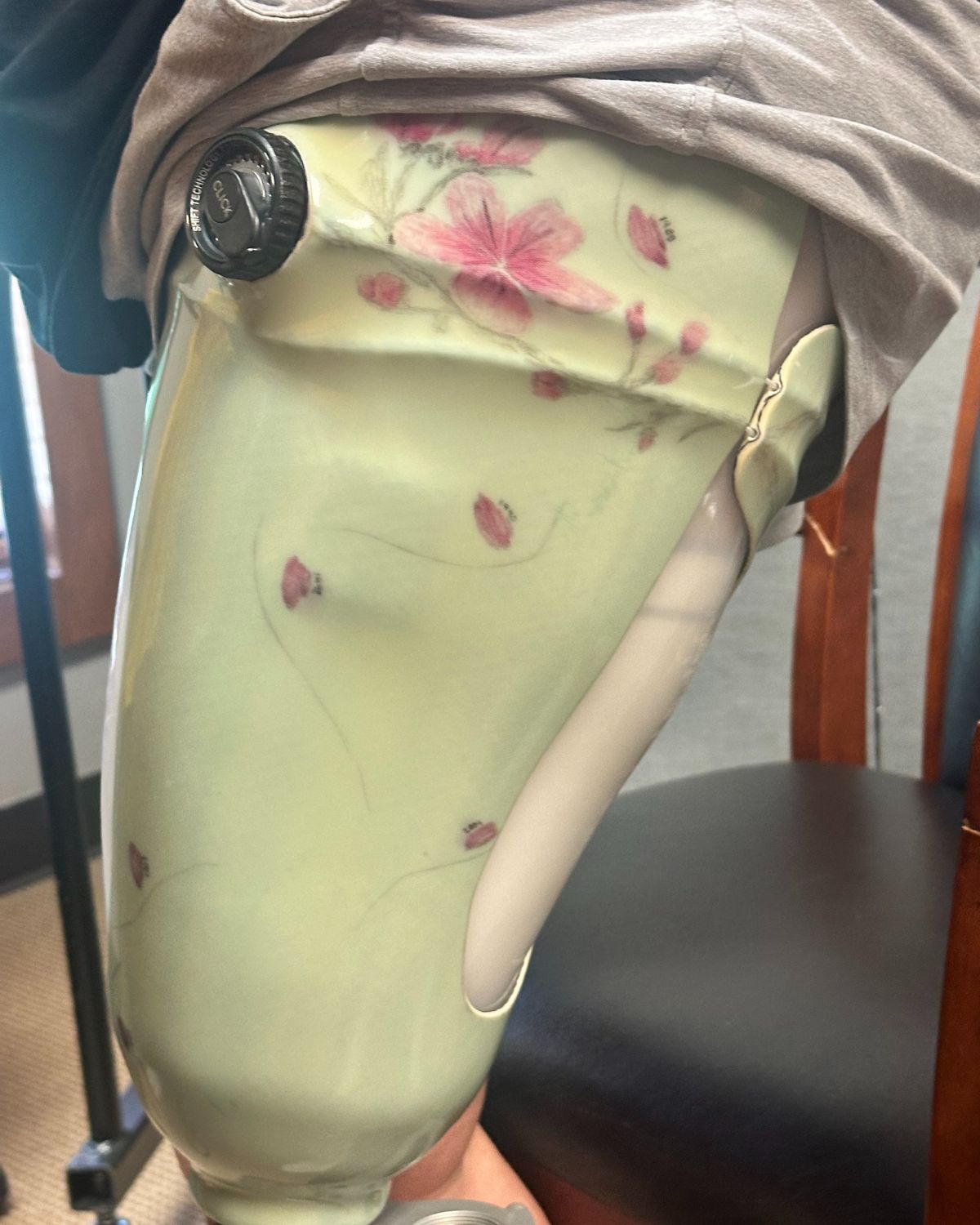 - The Moores’ daughter, Victoria, designed the artwork on Monica’s prosthesis.