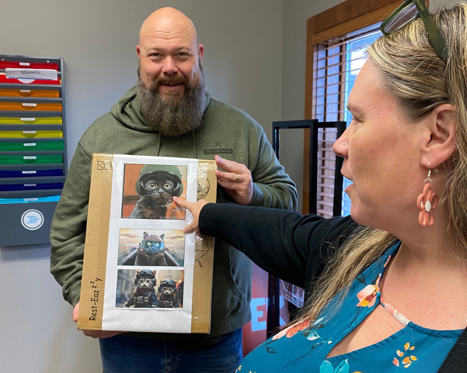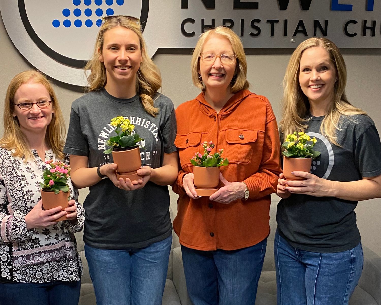 - NewLife’s Admins with their gifts for National Administrative Professionals Day! (L to R: Shannon Swartzlander – NewLifeKIDS & Students, Erin Powell – Connections, Linda White – NewLife’s Main Administrative Assistant, Abbey O’Bryan – Communications)