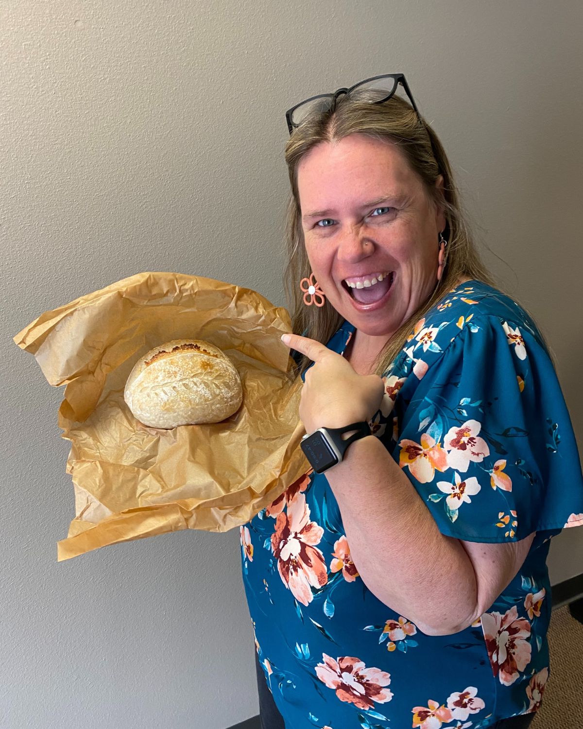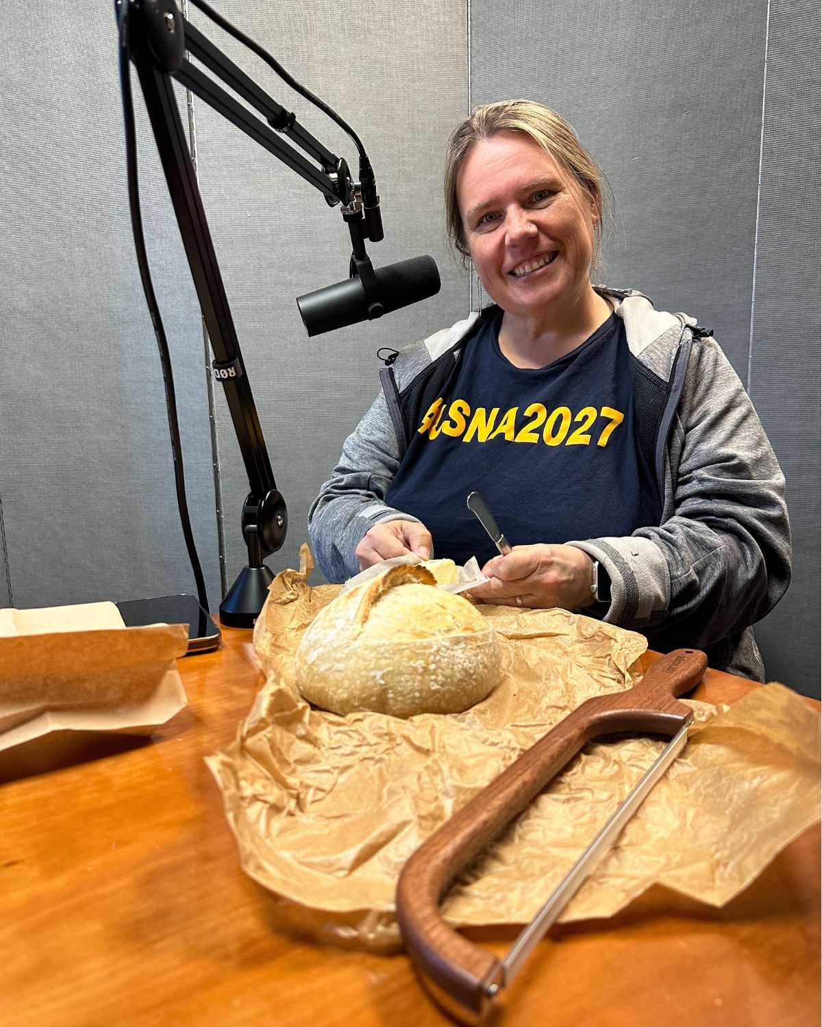 - In the studio, about to eat Kirsten’s first loaf of sourdough bread!