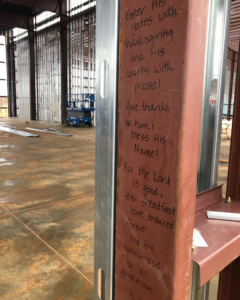 Psalm 100:4 is written on the steel frame of the building. This is just one of hundreds of verses covering the floors, framing, and walls of the Highlands Campus. We are so blessed by the faithful NewLifers who have prayed steadfastly during this journey.