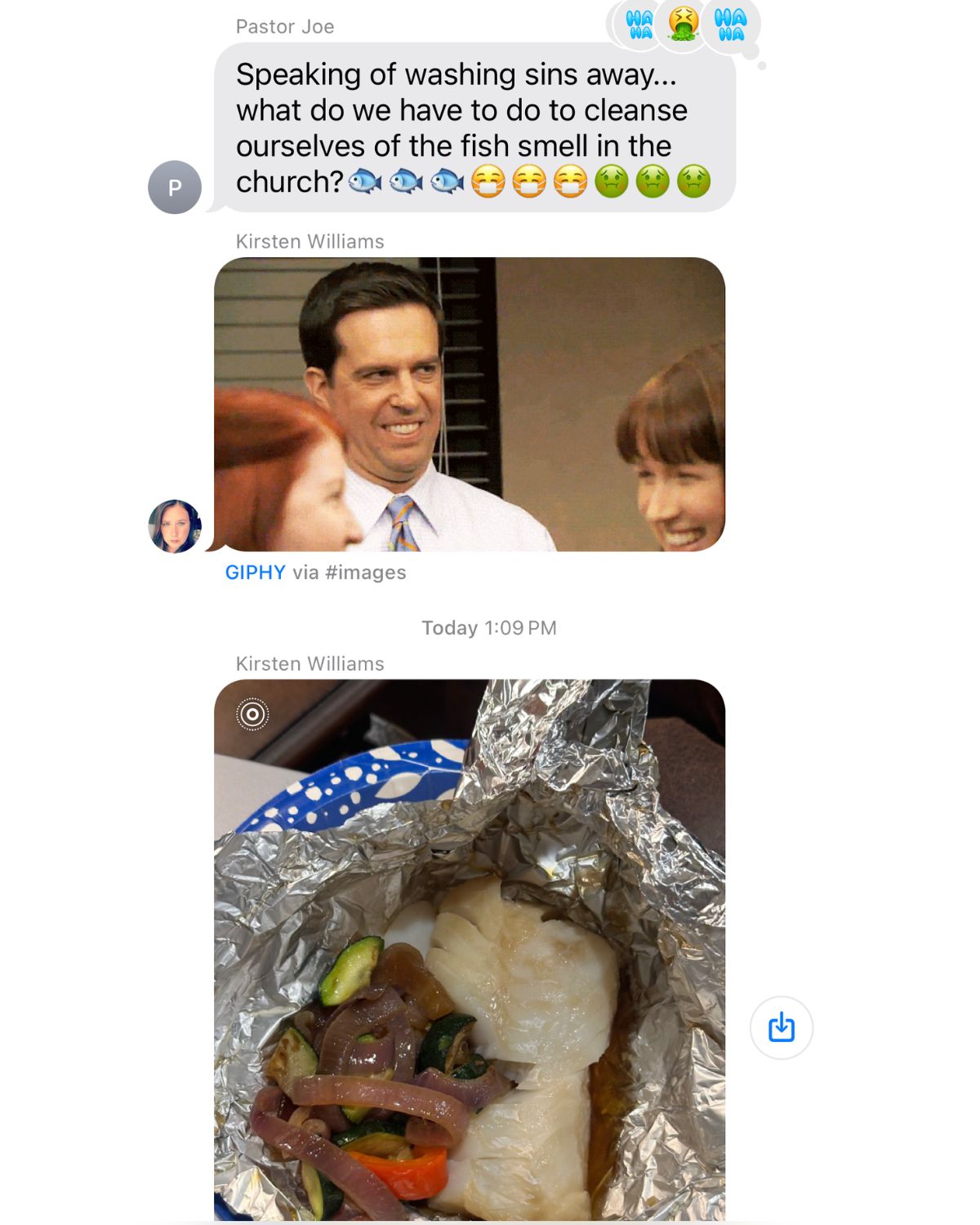 - Pastor Joe describing Kirsten’s ‘questionable’ lunch.